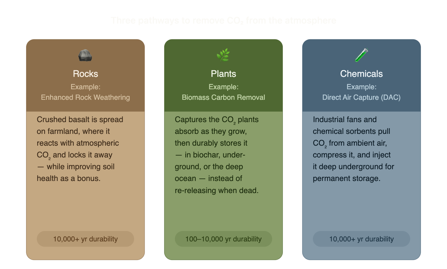 Caption: Rocks, plants, and chemical comprise the three modalities of CDR, with varying pathways and durabilities.